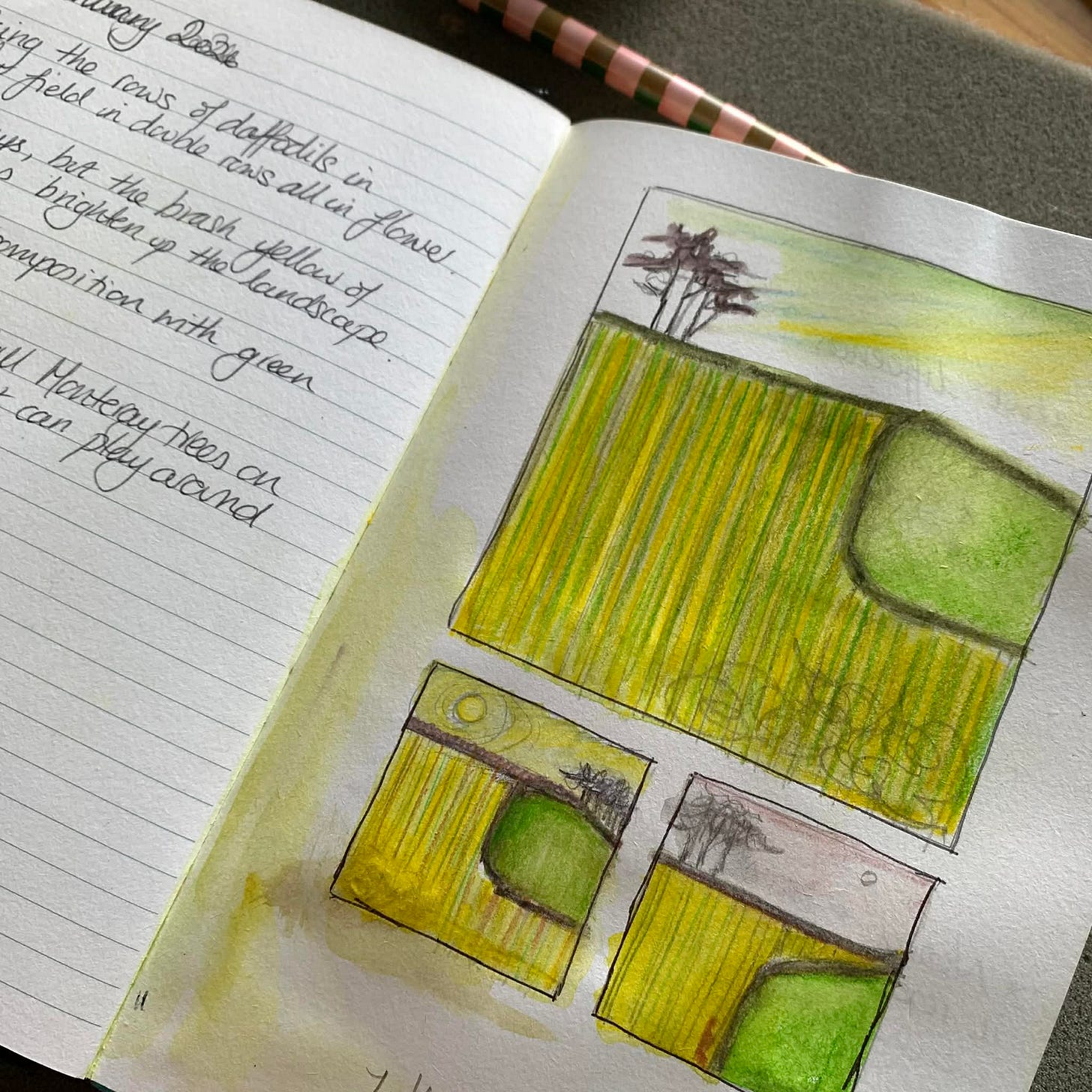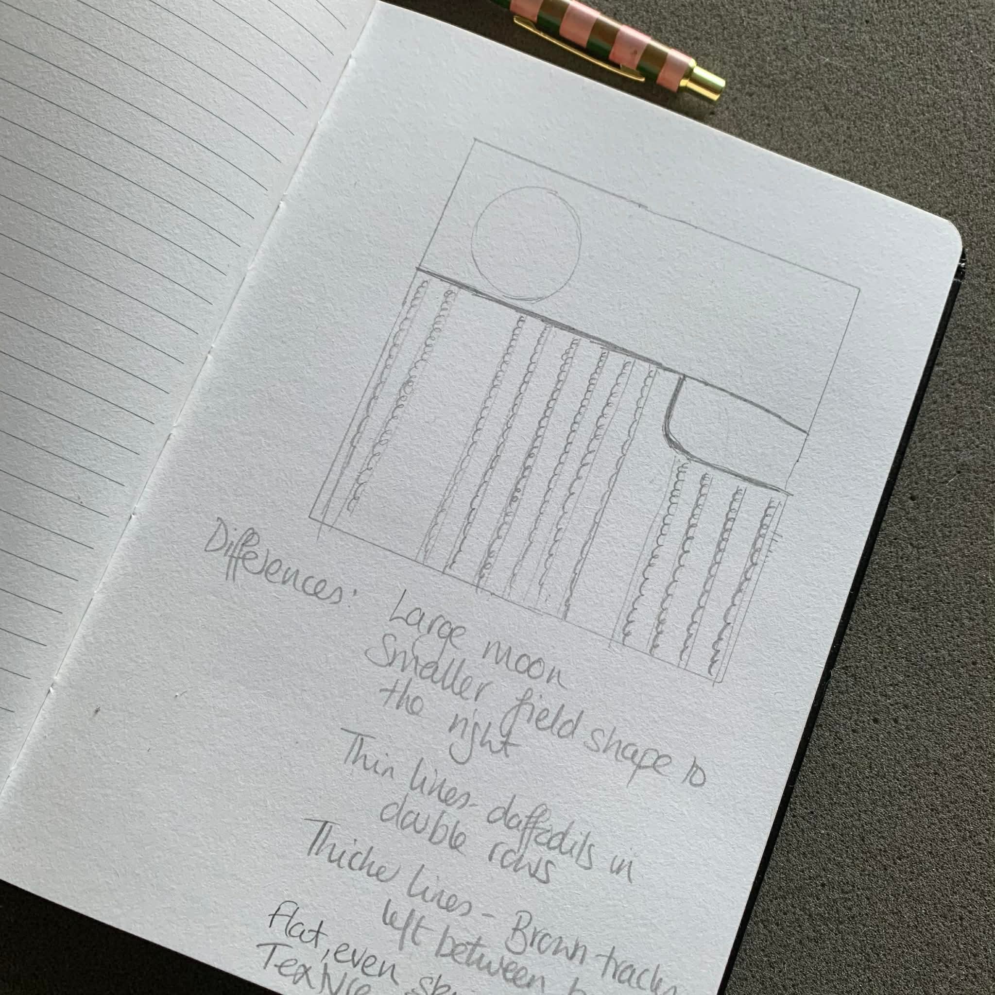 I’m still adding to my ‘field studies’ sketchbook - more recently to do with a neighbouring field full of daffodils which glow gold even on the dullest of days (and we’ve certainly had our fair share of those!) There is a definite pattern there which keeps drawing my eye - the double rows of blooms, the wider earth strips and the grass field that disrupts on the right hand side. There are tall Monterey pines on the top hedge. All these elements are great fun to play with to create different compositions, thinking about differences to make it interesting; thick and thin lines, small and large shapes, flat and textured.