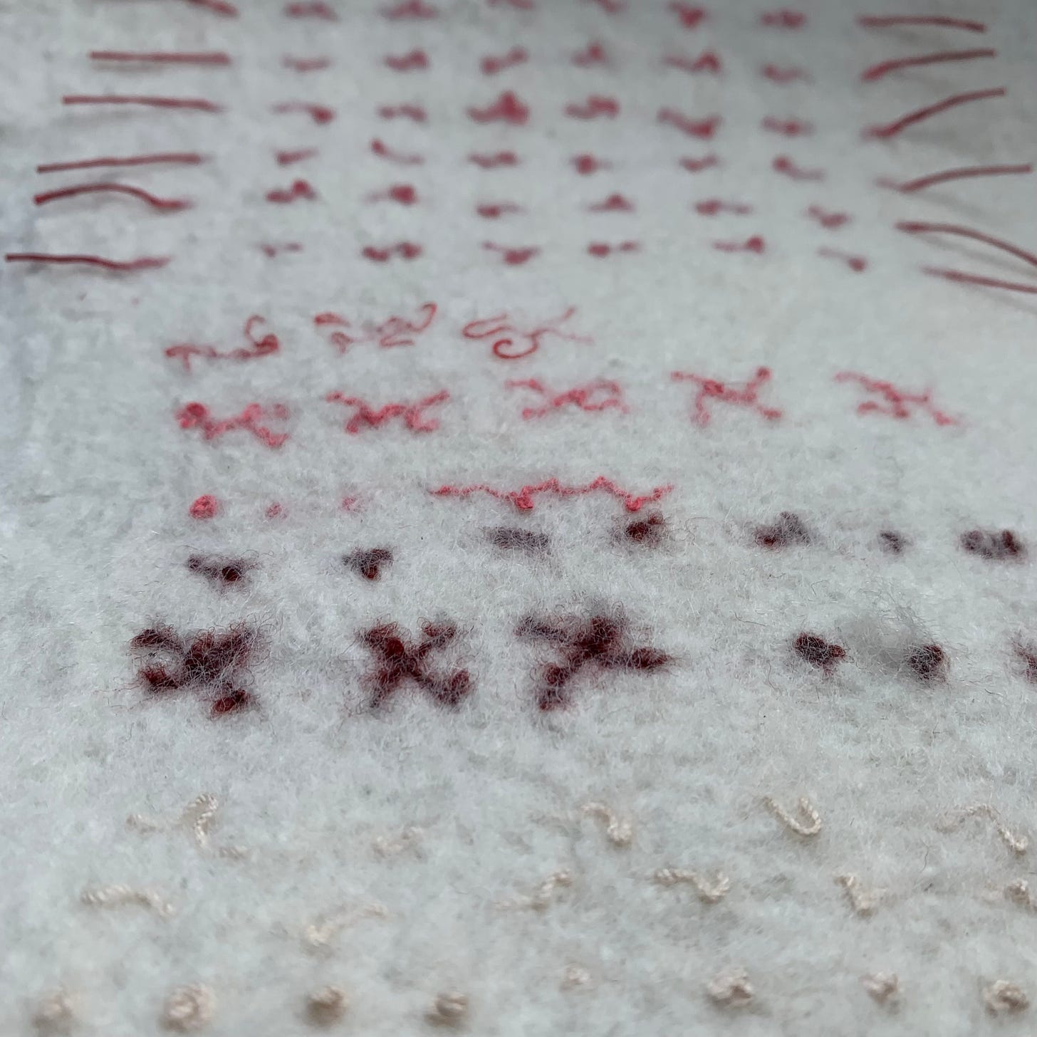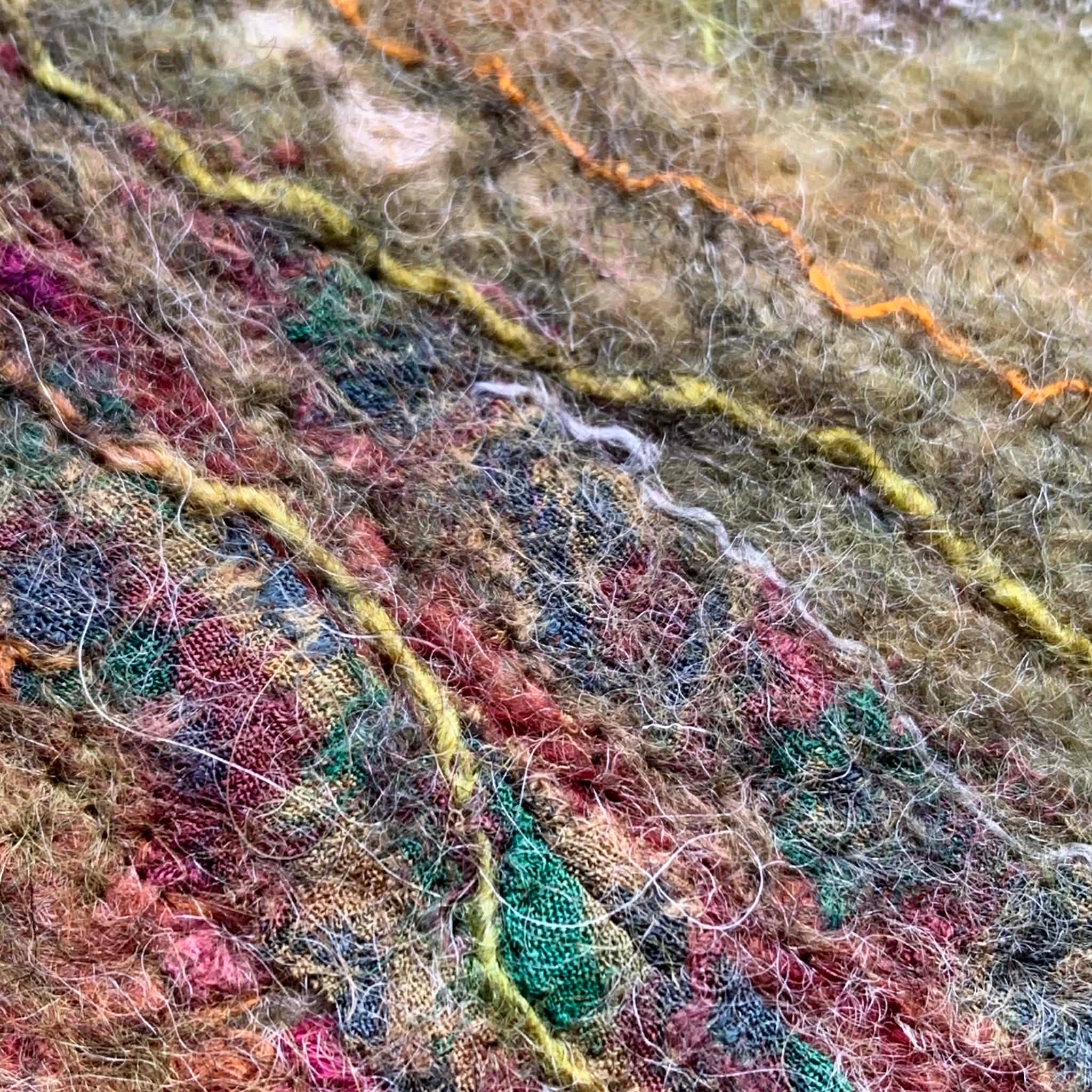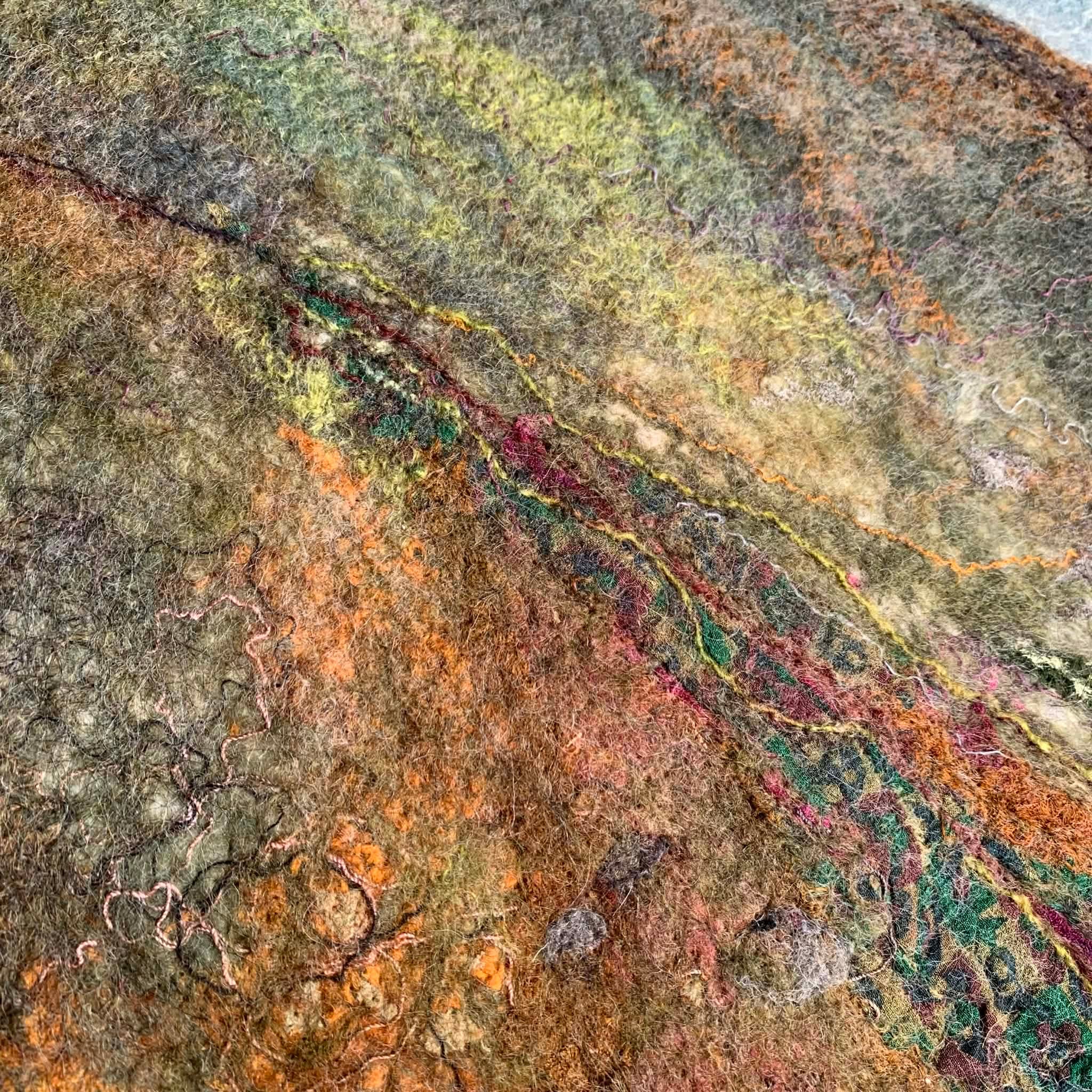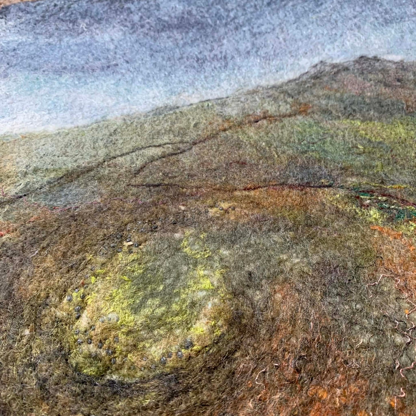 I am currently working on a felted landscape, based on my beloved moorland and whilst it’s taken me a couple of attempts I think I can now get this one over the finish line with a bit more tweaking. Here are some of the close up snippets of it - I love these clips that show how the threads wiggle as they embed themselves in the wool fibres as they mesh together during felting.